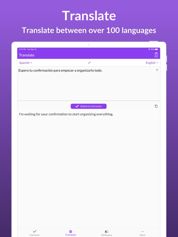 • Translate – Use our advanced translator to translate text between over 100 languages.  As well as easily put your English translations in the Corrector for further checks and improvements.