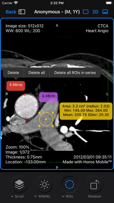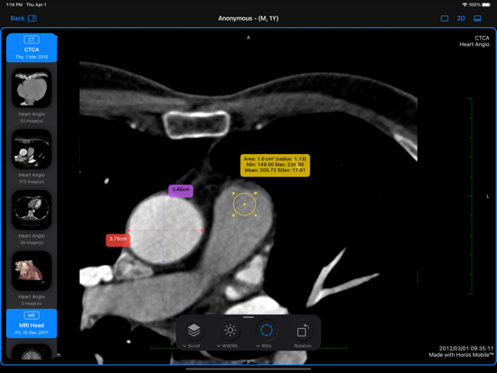 Horos Mobile™ displays DICOM format images from all modalities including ultrasound, CT scanner, MRI, PET, etc. This app includes easy-to-use processing tools including zoom, pan, WW/WL, ROI measurement etc.