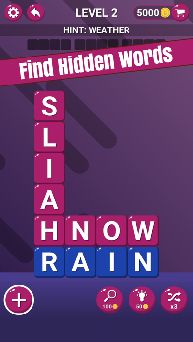 Playing this word puzzle game is easy! Simply swipe your finger over the letter tiles on board to select words. Find all the correct words to complete the level! Collect extra words to win bonus coins!