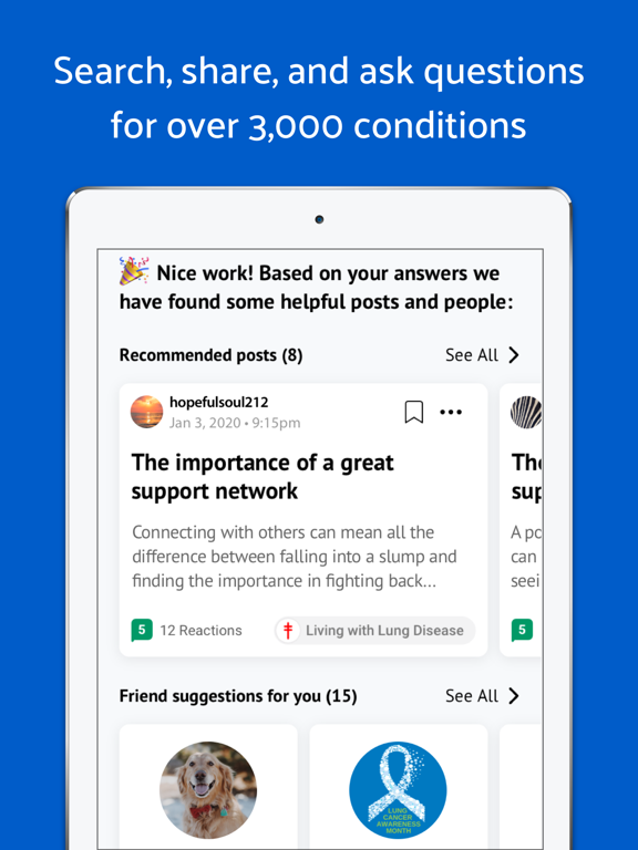 ◾ Health experiences sharing: Inspire provides a safe environment where members – both patients and caregivers – can learn from each other. You can easily search and connect with others who share the same lived experiences.
