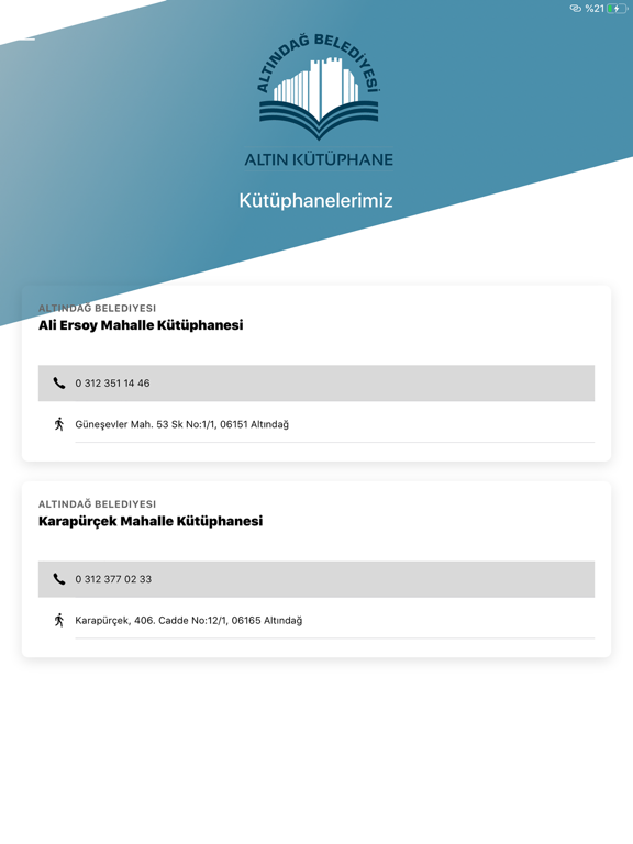 Altındağ Belediyesinin ilçe sınırları içerisindeki mahallelerinde açtığı kütüphaneler için hazırladığı mobil uygulamasıdır. Bu uygulama üzerinde kitap araması yapılabilir , kütüphanedeki kitapların bilgilerine ulaşılabilir ve ödünç alınabilirliği kontrol edebilir. Ayrıca kütüphane kullanıcısı oluşturarak kitap ayırtma işlemleri de bu uygulama üzerinden gerçekleştirilebilir.