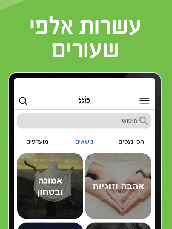 אפליקציית כולל מציעה את ספריית הוידאו הגדולה ביותר של שיעורי תורה, הלכה, מוסר והשקפה מטובי הרבנים, המרצים והארגונים בארץ ובעולם.
