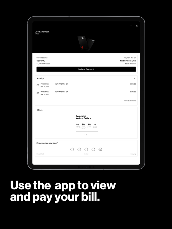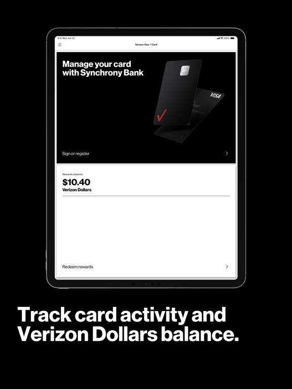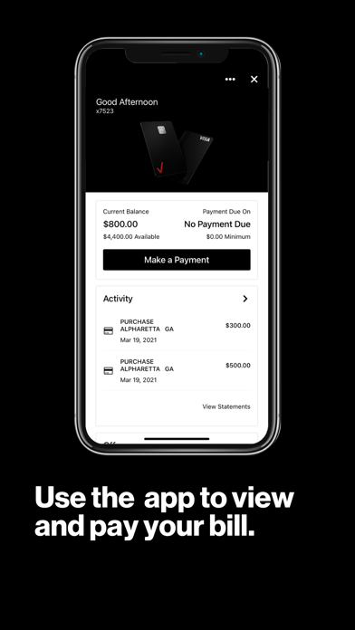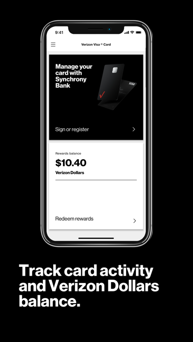 This is Verizon Visa® Card, issued by Synchrony Bank. This app helps you manage your credit card account — from paying your bill, checking your transaction history, and seeing how many Verizon Dollars you’ve earned, which you can then redeem for rewards on the My Verizon app.