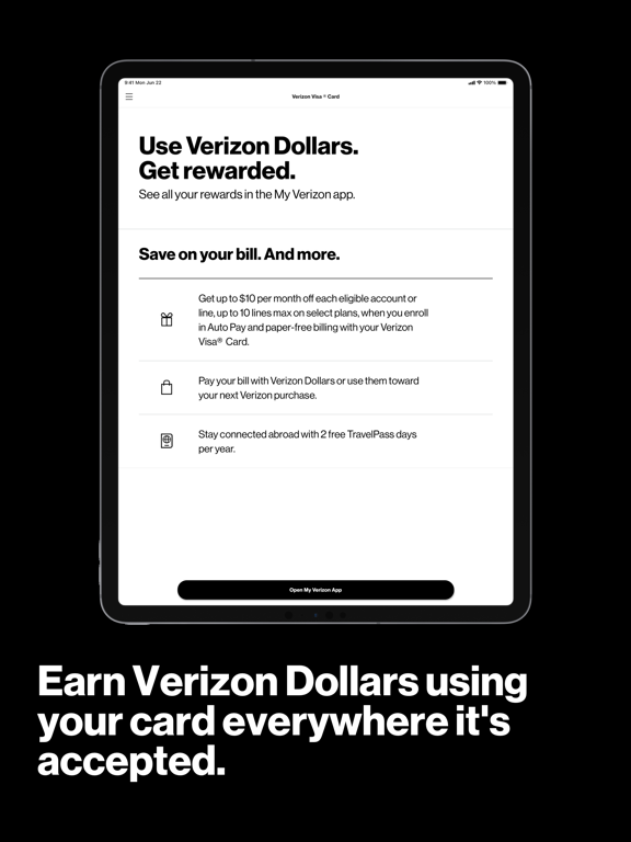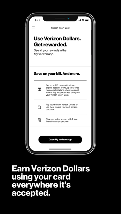 Use your Verizon Visa Card everywhere it’s accepted to earn Verizon Dollars*. To redeem your Verizon Dollars, go to the My Verizon app.