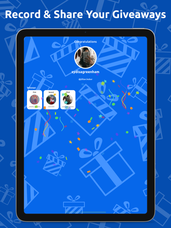 To share the winners & substitutes with your audience, you can record your screen (iOS has its own screen recording feature) or just take a screenshot of the final page.