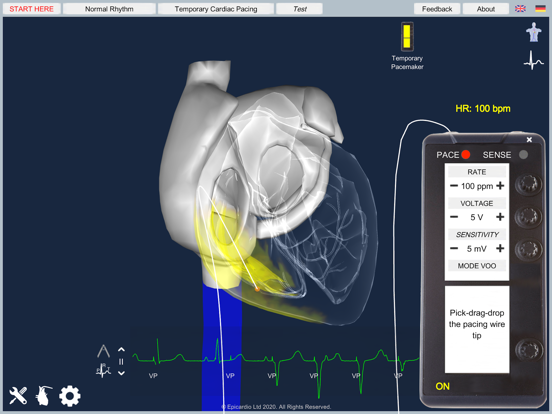 This app uses rendered 3D anatomy, interactive pacing tip placement and interactive control of pacing parameters. Utilises electrophysiology simulation and on-screen live ECG signals to simulate the effect of the pacing device on the heart rhythm for realistic training. Users can perform a temporary pacing procedure and take readings with common results and use pathologies they may not have had access to previously.
