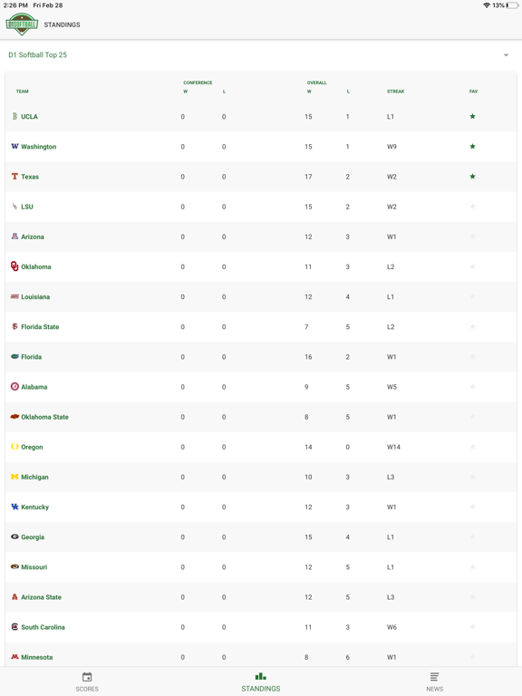 This subscription enables use of the D1 Softball app which provides up-to-date scores, standings, and schedules for Division I College Baseball. Once subscribed, you will be able to view information about your favorite Division I College Baseball teams. While viewing team standings, by conference, you can select teams as favorites. Games for your favorite teams will show up first in the scores view. You can also receive alerts, in the form of push notifications, for selected teams.