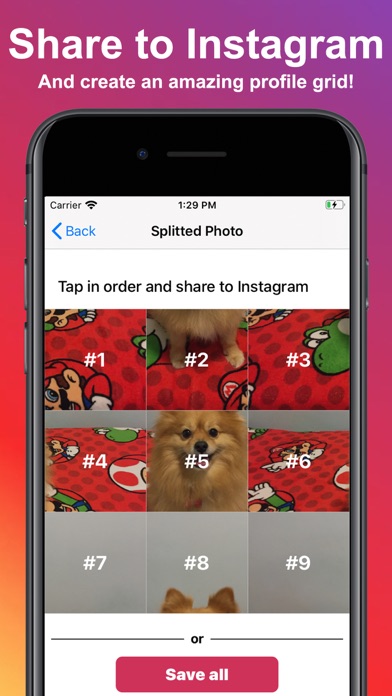It's really easy: Just select a picture, choose one of the 5 grid layouts and split your picture! It's really easy to share to Instagram too! Just tap the image fragments in the indicated order!