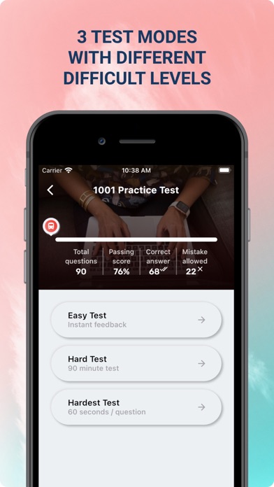 • Mock test: Mock test simulates the real test format. When you finish the test you will see your score and review all the questions.