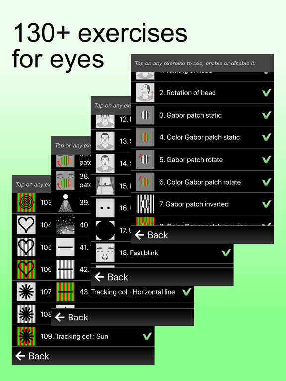 • Access to 136 exercises for eyesight with the ability to disable any exercise that doesn't suit you. All eye exercises are animated and there are additional hints: graphics, voice, text and video.