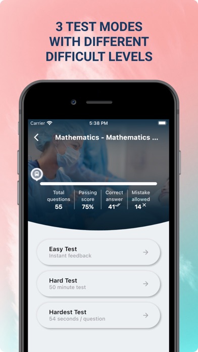 • Mock test: Mock test simulates the real test format. When you finish the test you will see your score and review all the questions.