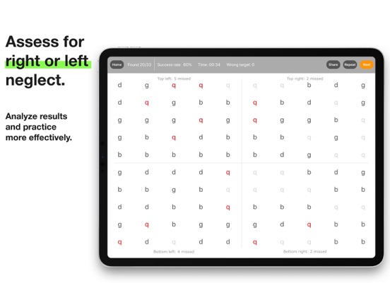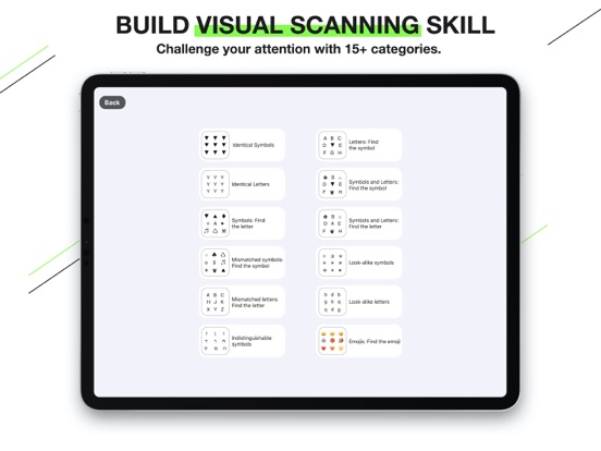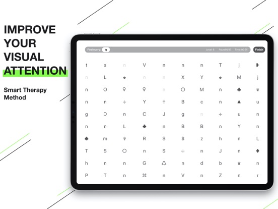 Improve scanning by finding targets in a grid. You can adjust the grid size and the difficulty. Learn to move the eyes correctly by scanning from left to right across the screen. Just like reading a book. In this way, you will improve your reading and speed of processing.