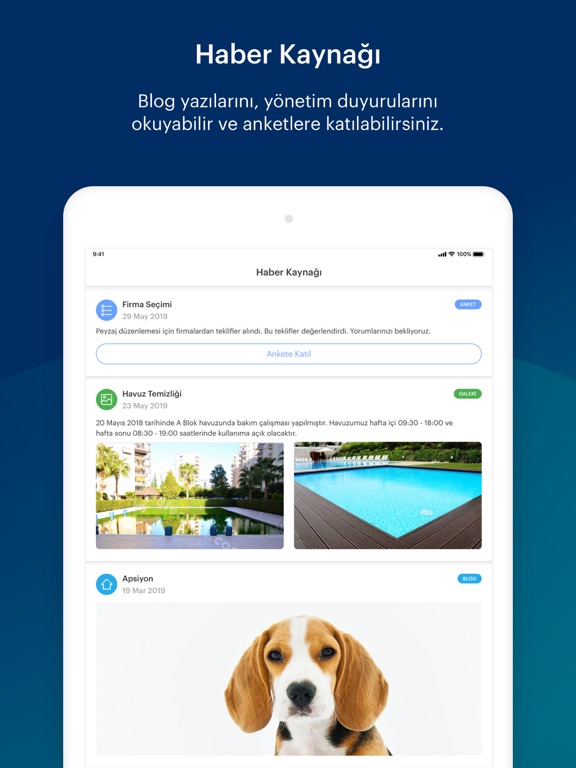 • Anket ve Fotoğraflar: Yönetiminizin sizlerle paylaştığı anketlere katılabilir, paylaşılan fotoğraflara yorum yazabilirsiniz.