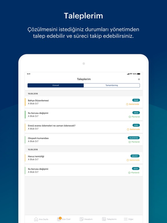 • İş Talebi ve Takibi: Örneğin, musluğunuz bozuldu. Bunun için iş talebi açıp ardından takibini de gerçekleştirebilirsiniz.