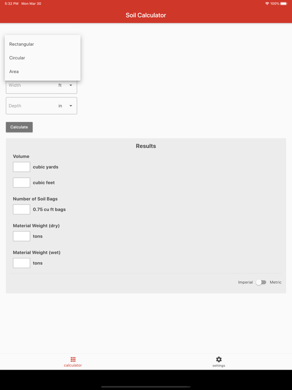 The app outputs the amount of soil required in cubic yards, cubic feet, tons, metric tons, cubic meters, liters, and the number of bags of soil needed.