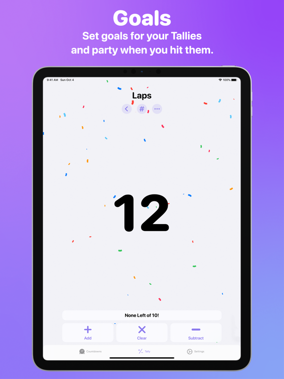 With Tallies, you can create unlimited tallies to count up to or down to a goal. When you hit this goal, you will see confetti on the screen! You can easily add or subtract any of your Tallies from the main tab, as well as see their current total.