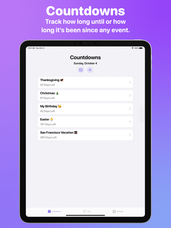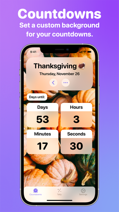 With Countdowns, you can count how long it is until a certain event, such as your birthday. You can also count how many days it's been since an event, such as starting a diet. You can also set a custom background for each Countdown for a more beautiful look. You will also get a notification when the Countdown is finished!