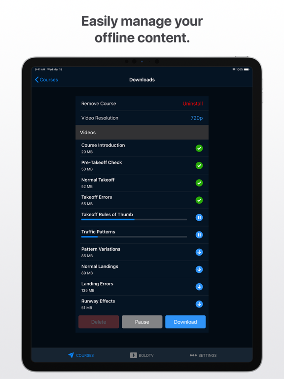 Access the same Mastering Takeoffs and Landings course content you use on your computer, including all of the videos, quizzes, content, and tests. Plus, the app works when you're online or offine, so you can watch the videos wherever you are.