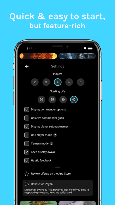 - Quickly reset games to starting life of 20, 25, 30, or 40 - your choice. Optionally, let the app randomize seating for you to keep things interesting.