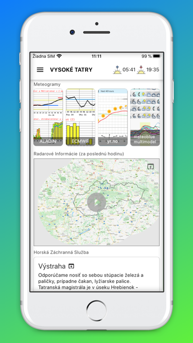 Aplikácia poskytuje komplexné informácie o počasí a podmienkach na horách. Zobrazuje informácie z rôznych, dostupných zdrojov na jednom mieste. Aplikácia zobrazuje: - aktuálne zábery z hôr - predpoveď počasia, výstrahy, meteogramy - čas východu a západu slnka - informácie horskej služby - lavínová situácia a predpoveď - odkazy na komunity ľudí na sociálnych sieťach - satelitné zábery - predpoveď oblačnosti