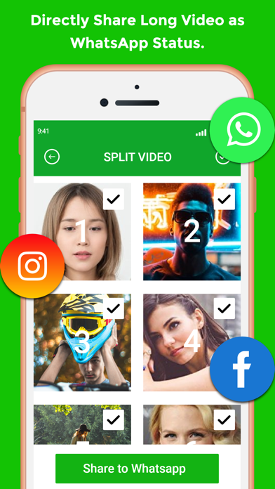 Disclaimer: The "WhatsApp", "Facebook"and "Instagram": name is copyright of WhatsApp Inc, Facebook, Inc and Instagram. Video Splitter is in no way affiliated with, sponsored or endorsed by WhatsApp, Inc. Facebook, Inc. and Instagram. If you notice that any content in our app violates copyrights, then please inform us.