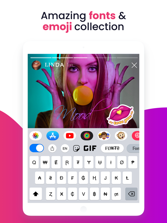 Fonts - Fancy Keyboard provides the most popular fonts which you can simply select from your keyboard: bold, cursive, gothic, italic, bubble and many others.