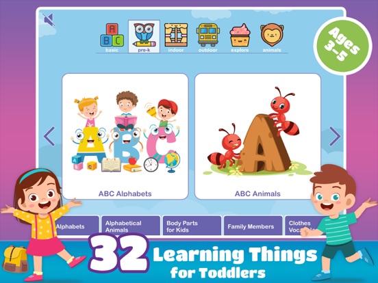 ABC Alphabets (alphabetical a to z), ABC Animals (alphabetical animals a to z), Body Parts for Kids, Family and Clothes.