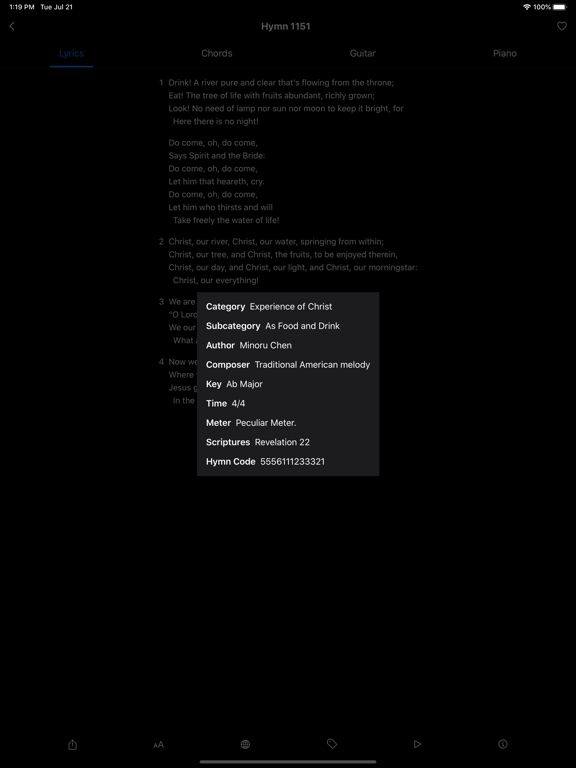 - Hymn information, including key, time signature, meter, and scripture reference.