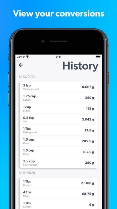 Cooking Conversions allows you to convert ingredients/food from mass (weight) to volume and from volume to mass, convert kitchen cooking units (mass, temperature, volume, and distance), and quickly look up your past conversions.