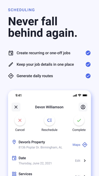 • Jobs: Pause/resume recurring jobs and easily add, cancel or reschedule jobs so your schedule is always up to date. Add multiple recurring jobs to one property (i.e. weekly lawn care, bi-monthly gutter cleaning)
