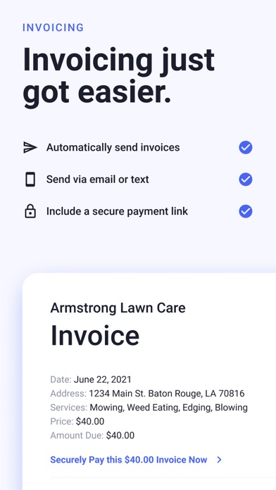• Automatic Invoices: When you complete a job, automatically send professional looking invoices to your clients via text or email with a link to pay online.
