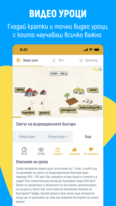 Когато видиш отговорите на теста, с един клик можеш да си пуснеш точния откъс от урока, с който бързо да запълниш пропуските си. Ако пък имаш въпроси, можеш да напишеш коментар под видео урока и нашите учители ще ти отговорят.