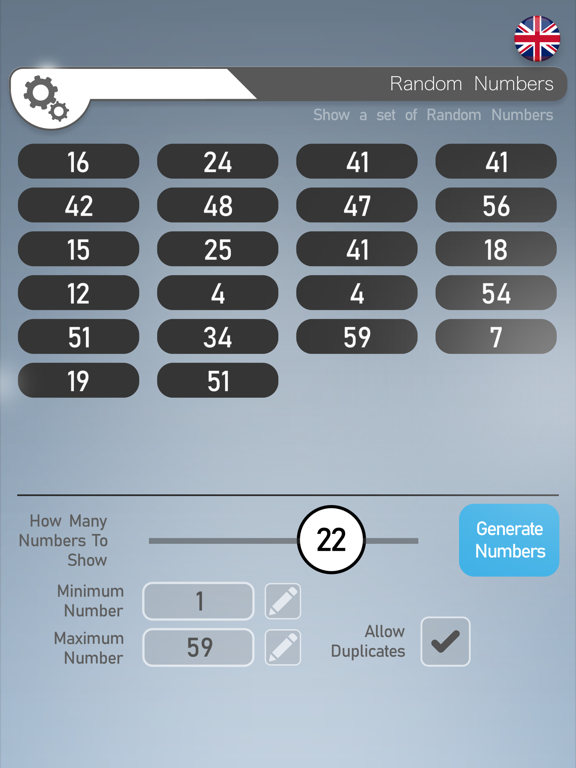 It will display a set of up to 32 numbers all picked from a minimum and maximum value, press the button to regenerate them. You can choose a number from 0 to 99999 it will also allow duplicates if required.