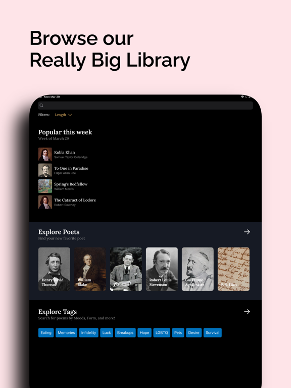 We’ve also created “Explore” sections in our ForYou and Search pages, which highlight specific periods in history by suggesting authors and poems from the period. Take advantage of these sections if you’re curious about specific periods!