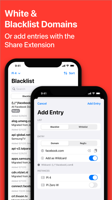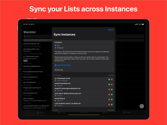Quickly add new entries to your lists inside the app or with the iOS Share Extension. You can also add entries in bulk and export list entries. If you have two Pi-hole instances, you can even automatically sync your lists!