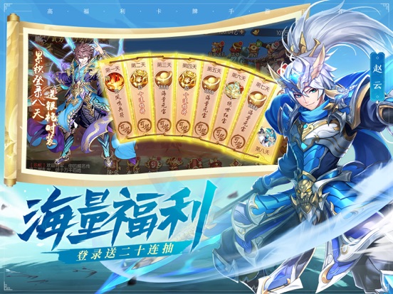 将高福利进行到底,就要玩个爽!登陆就送二十连抽,七天登陆送赵云,首周送30000元宝资源及精美时装,更有VIP免费送!福利拿到手软,不怕你不用,就怕用不完!