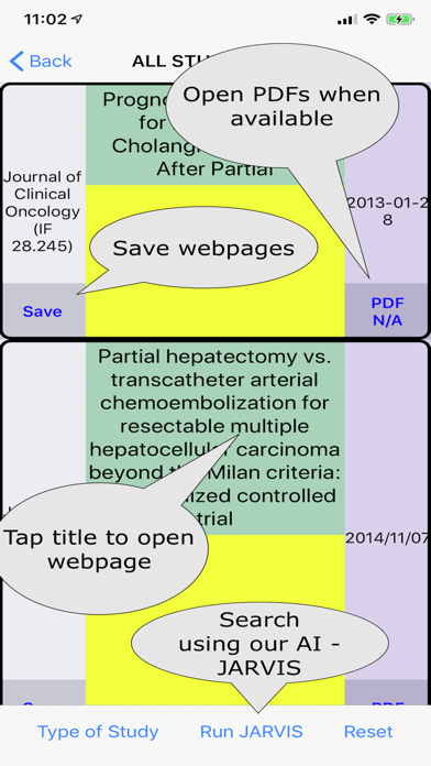 An example would be a search for clinical studies on pancreatic cancer - our app retrieves the most ground breaking randomized studies in NEJM, JAMA etc organized at the top, while Google Scholar retrieves articles not so relevant in the clinical field, or are not as trustworthy. However, searching for pancreatic cancer in the "Basic Science" section in our app would retrieve relevant lab studies at the top. Try this out yourself! You can also organize clinical studies by the type of the study at the push of a button. While we do include journal Impact Factors, please sort by study type or by using JARVIS for better results. Impact factors are going out of favor.