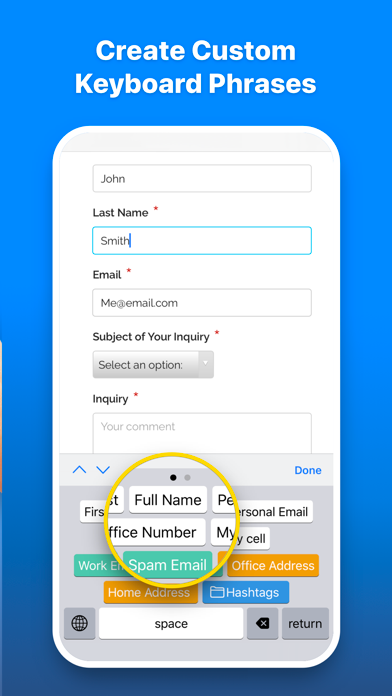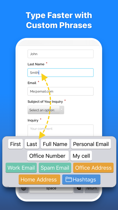 Personalize your custom phrases and templates, save time by inserting snippets, templates, phrases and much more, with just a tap of your keyboard.