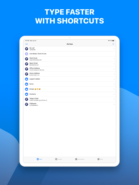Nextboard keyboard, is a great tool for custom text replacement by creating smart keyboard shortcuts.