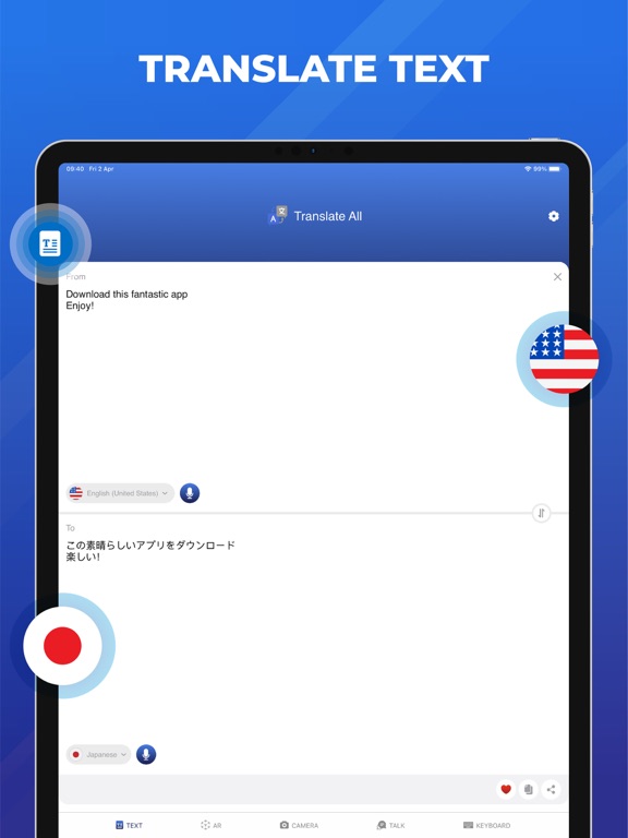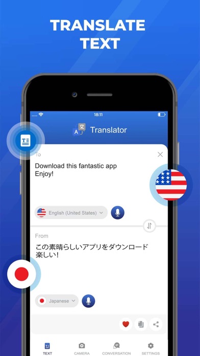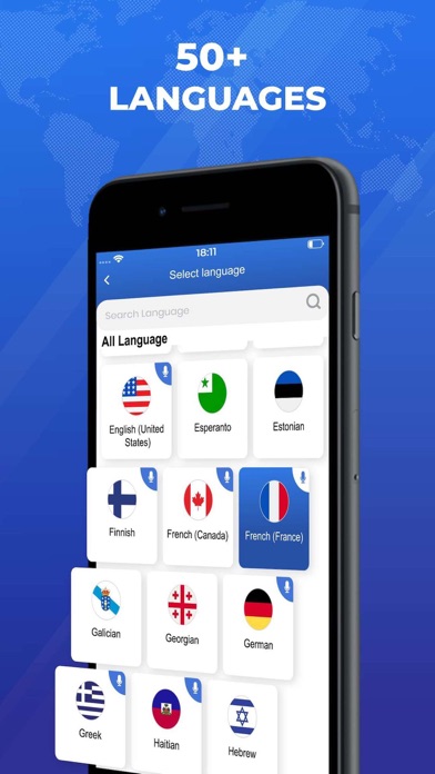 You’ll use your camera to translate Text, Documents, Menu or any other pictures. Translate voice to voice in over 50 Languages.