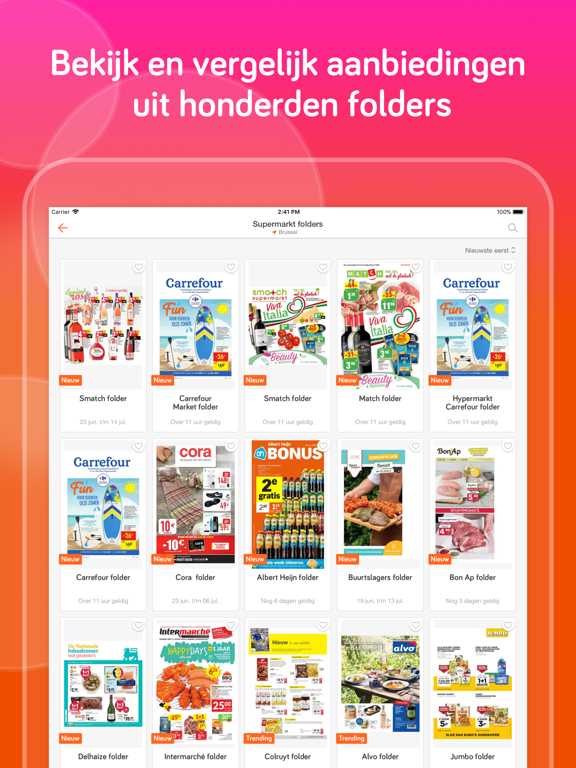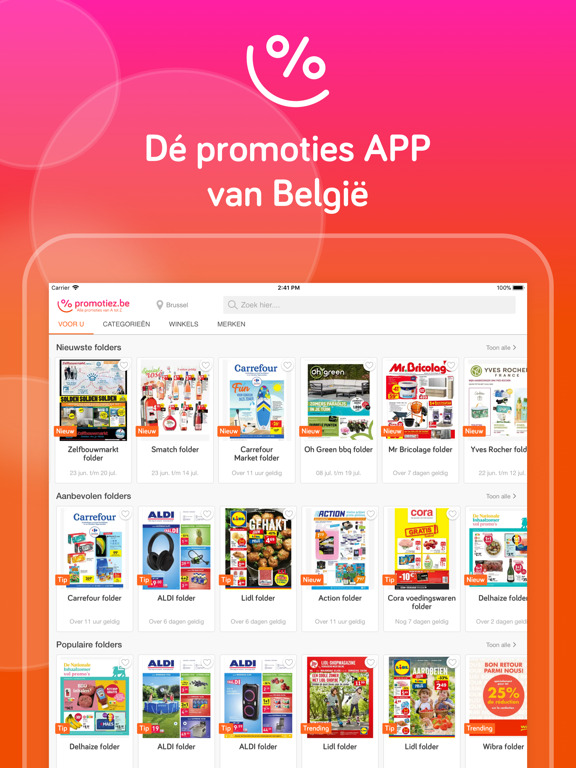 Promotiez app toont u ALLE promoties, folders en folder aanbiedingen van grote en kleine winkels in België. Niet alleen alle supermarkten en doe het-zelf-zaken, maar ook elektronicazaken, mode-, speelgoed-, computer-, en beauty winkels en nog veel meer. Zelfs lokale shops hebben we voor u vermeld. Wilt u een zaak als favoriet selecteren, dan kan dit eenvoudig door op het hartje te klikken. Hiermee bent u altijd als eerste op de hoogte van aanbiedingen van uw favoriete shops en heeft u uw favoriete reclamefolders handig bij elkaar verzameld.