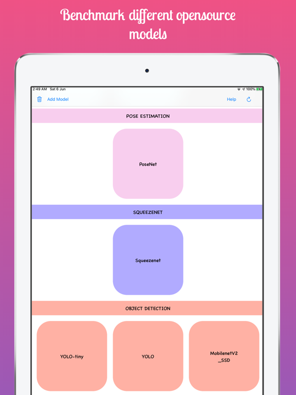 In addition to the deep learning models that comes with the App by default, you can add your custom CoreML models for visualizing the result and benchmarking.