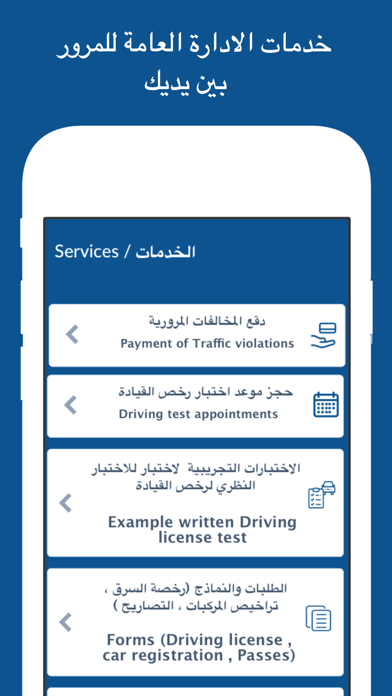 يقدم التطبيق الخاص بالإدارة العامة للمرور عدة خدمات: