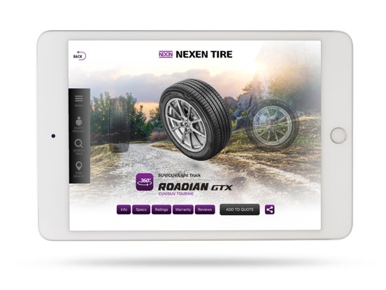 The Nexen Tire app is your one-stop source for all product information. Looking for a performance, passenger, CUV, SUV, light truck, commercial, or winter tire; this is the app for you! Browse Nexen’s full lineup of tires in an intuitive and interactive environment. Quick access to tire information, specifications, warranty, tire ratings, and product reviews gives you all the resources you need to choose the tire perfect.