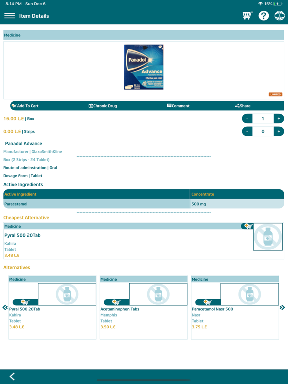 * Look up any medicine available in the Egyptian market, all its alternatives, brands or generics.