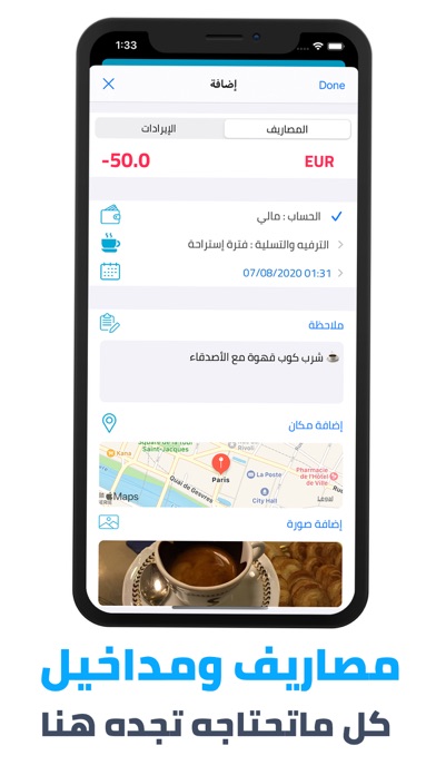 يتميز تطبيق مصاريف : محفظة إلكترونية لإدارة مصاريفك ب :