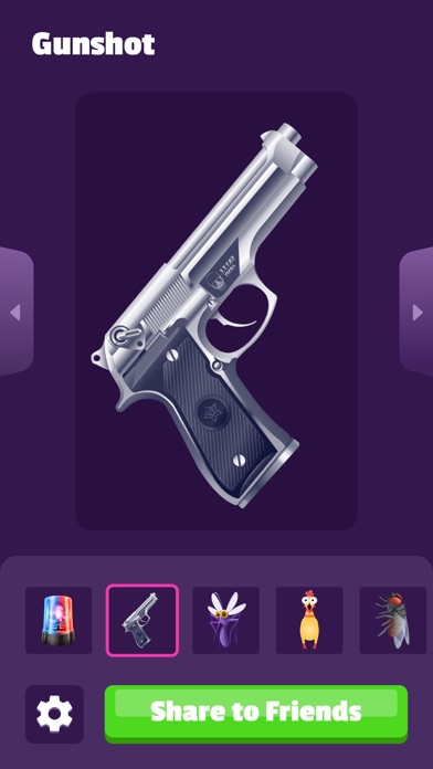Air Horn, Police Siren, Razor, Fart Sounds, Gunshot, Motorcycle, Dog Barking, Mosquito, Rubber Chicken, Fly etc.