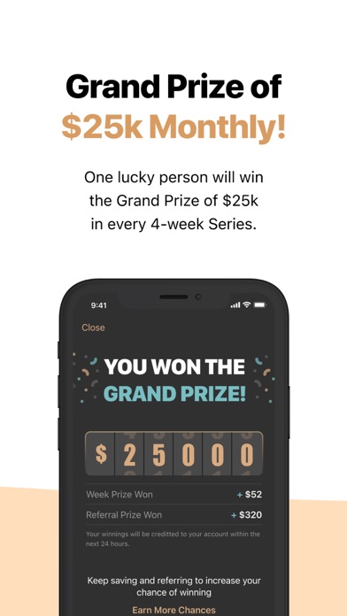 PrizePool is a new type of savings app where you can win one of the over 4,000 cash prizes totaling $50k in every 4-week Series simply by saving money. One lucky winner will get the $25,000 Grand Prize out of this guaranteed PrizePool. Whether you win or not, you'll never lose your deposit and all your money is FDIC insured with no fees or minimums.