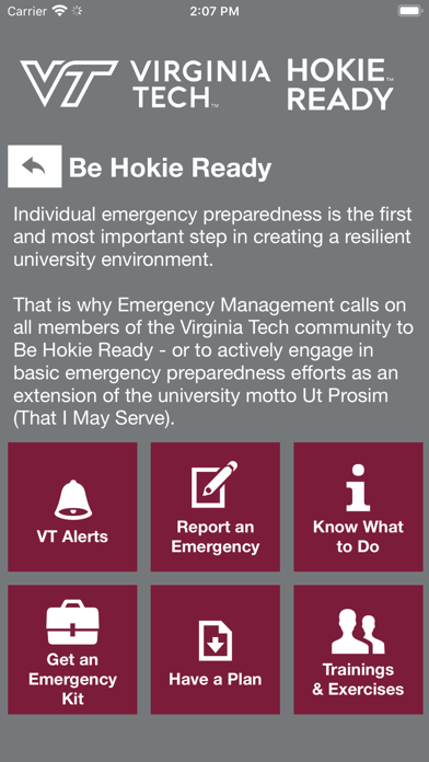 Hokie Ready is the official safety app of Virginia Tech. It is the only app that integrates with Virginia Tech's safety and security systems. Virginia Tech Emergency Management has worked to develop a unique app that provides students, faculty and staff with added safety on the Virginia Tech campus. The app will send you important safety alerts and provide instant access to campus safety resources.