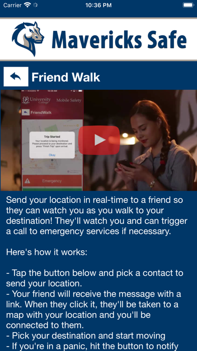 - Friend Walk: Send your location to a friend through email or SMS on your device. Once the friend accepts the Friend Walk request, the user picks their destination and their friend tracks their location in real time; they can keep an eye on them to make sure they make it safely to their destination.